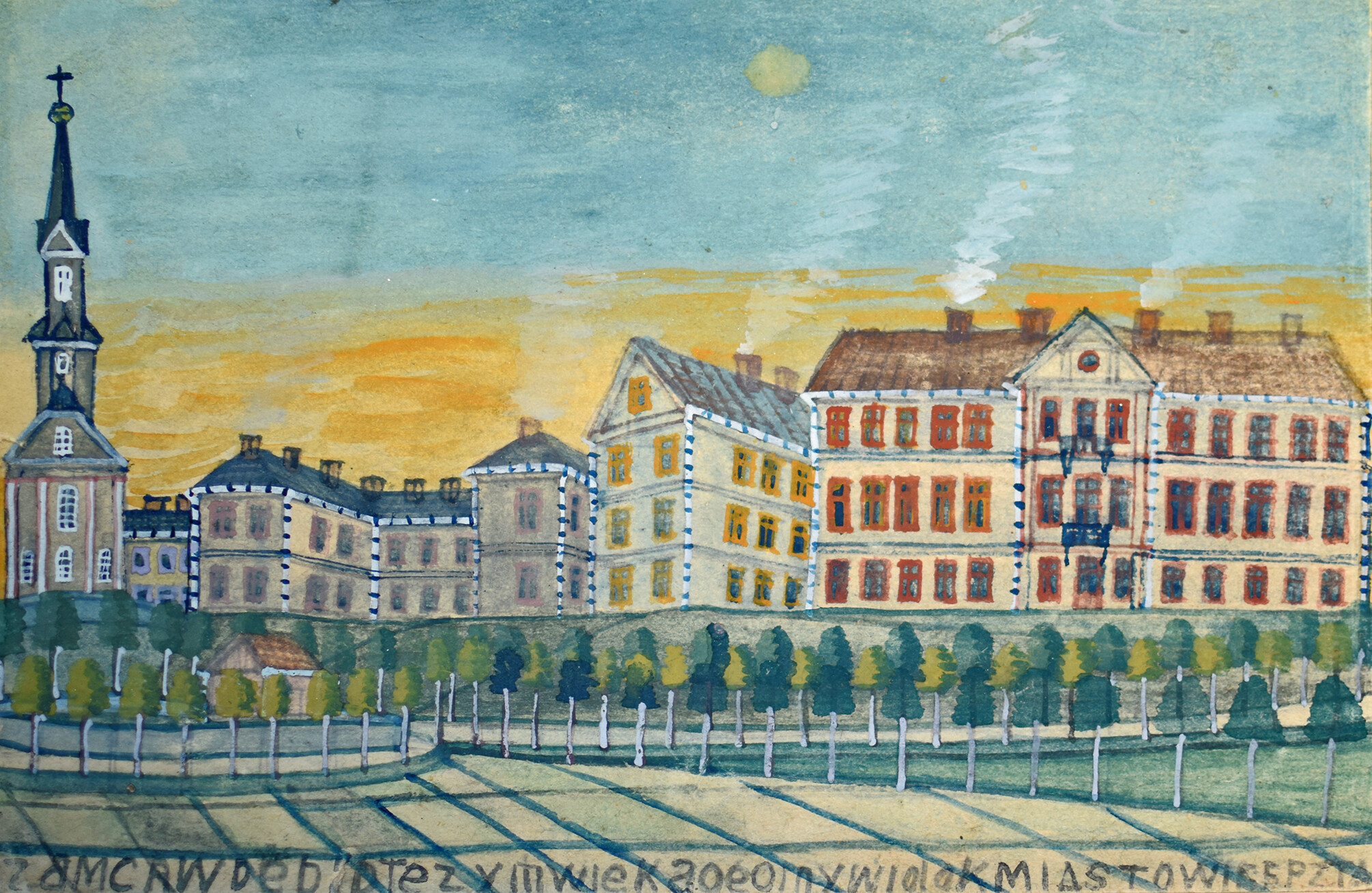 "Architektura miejska z kościołem i szachownica pól na pierwszym planie"