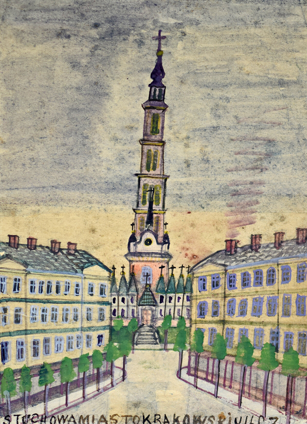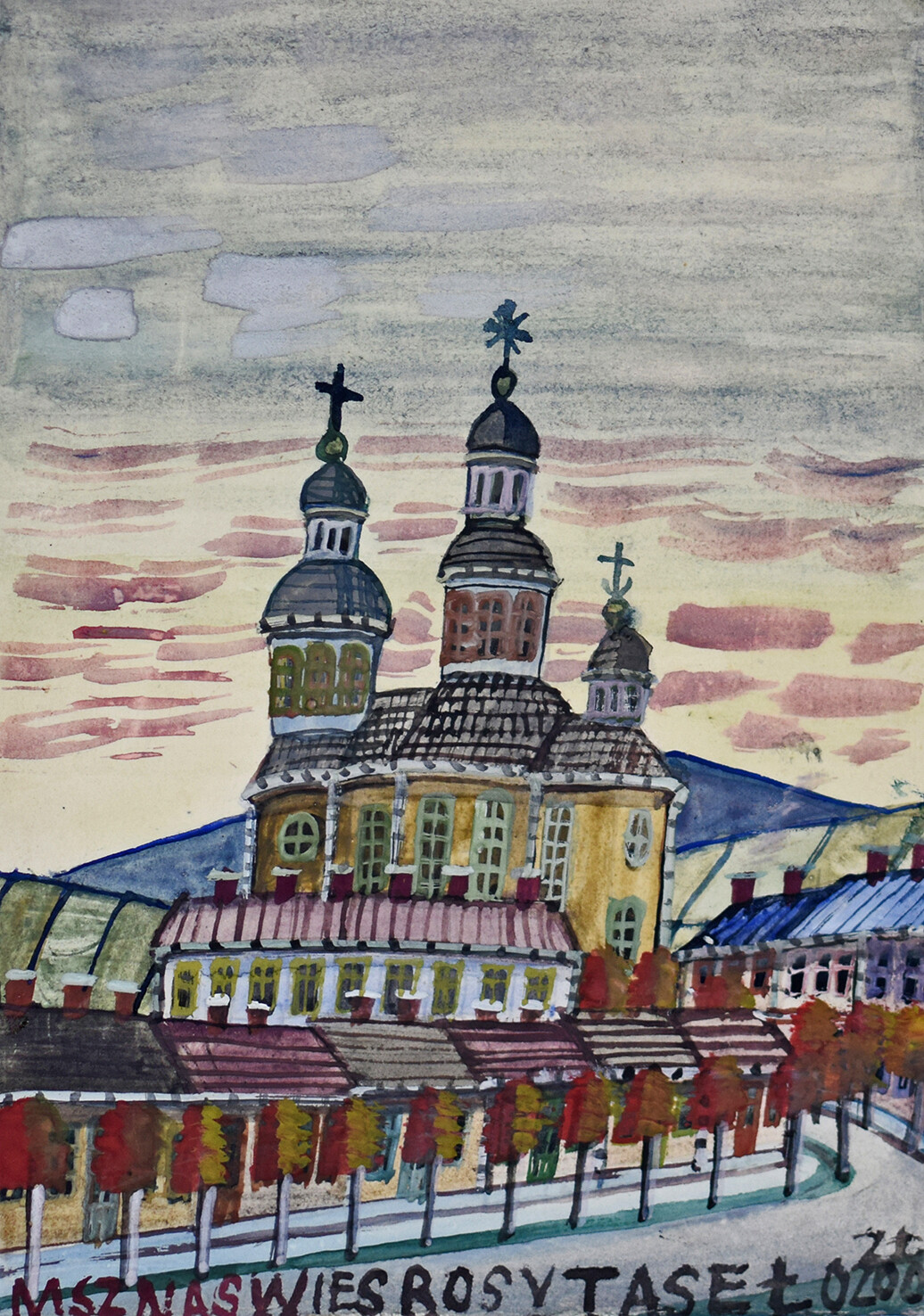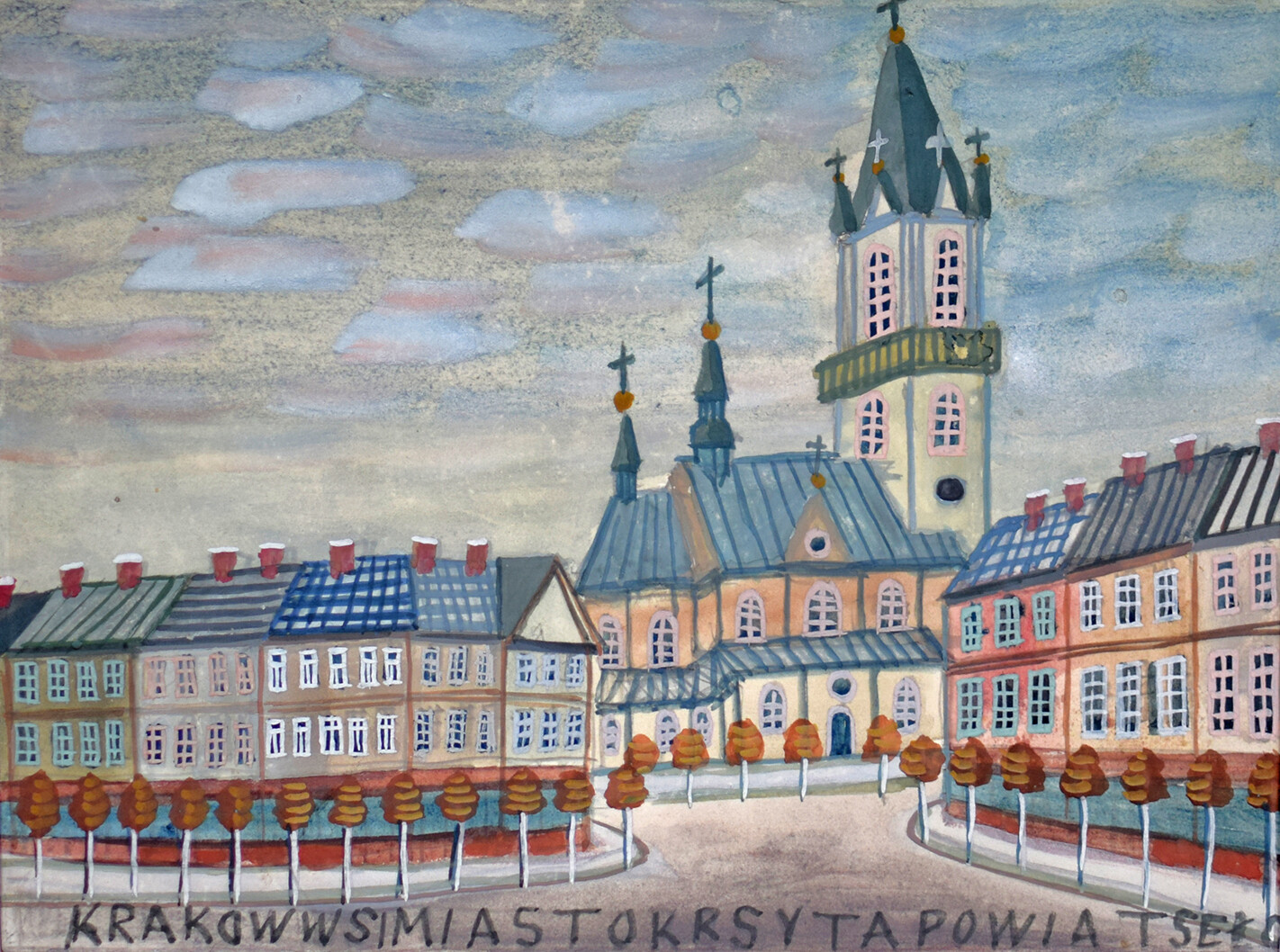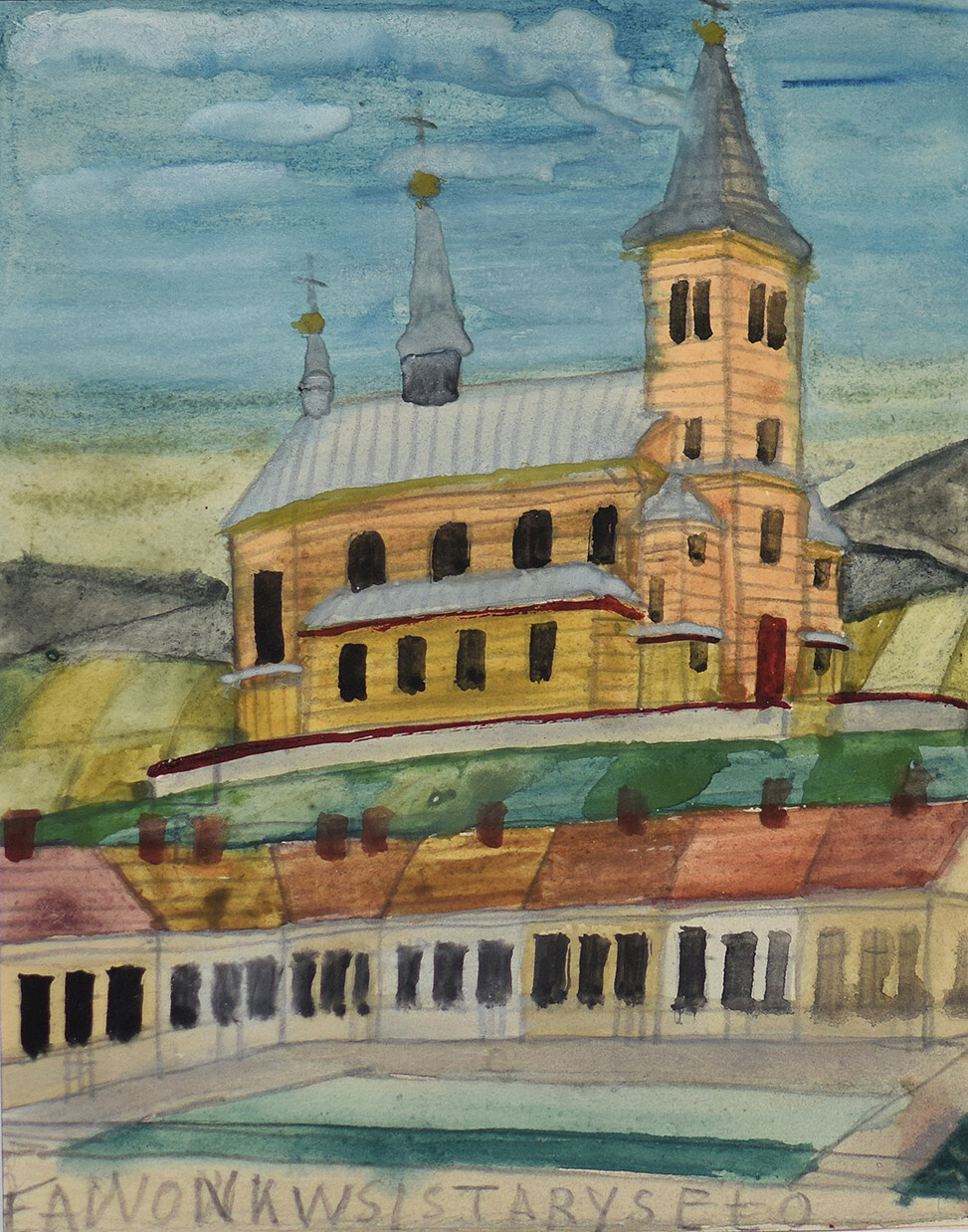 Title: A fragment of the small town market square with a church (Stary Sącz)