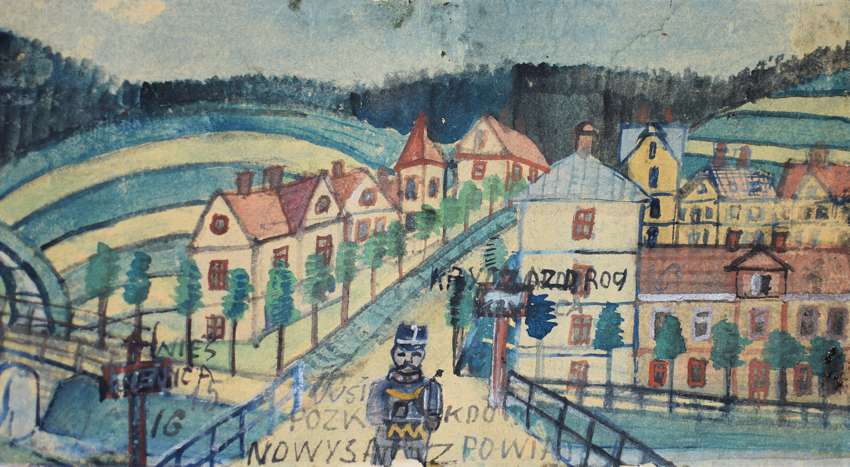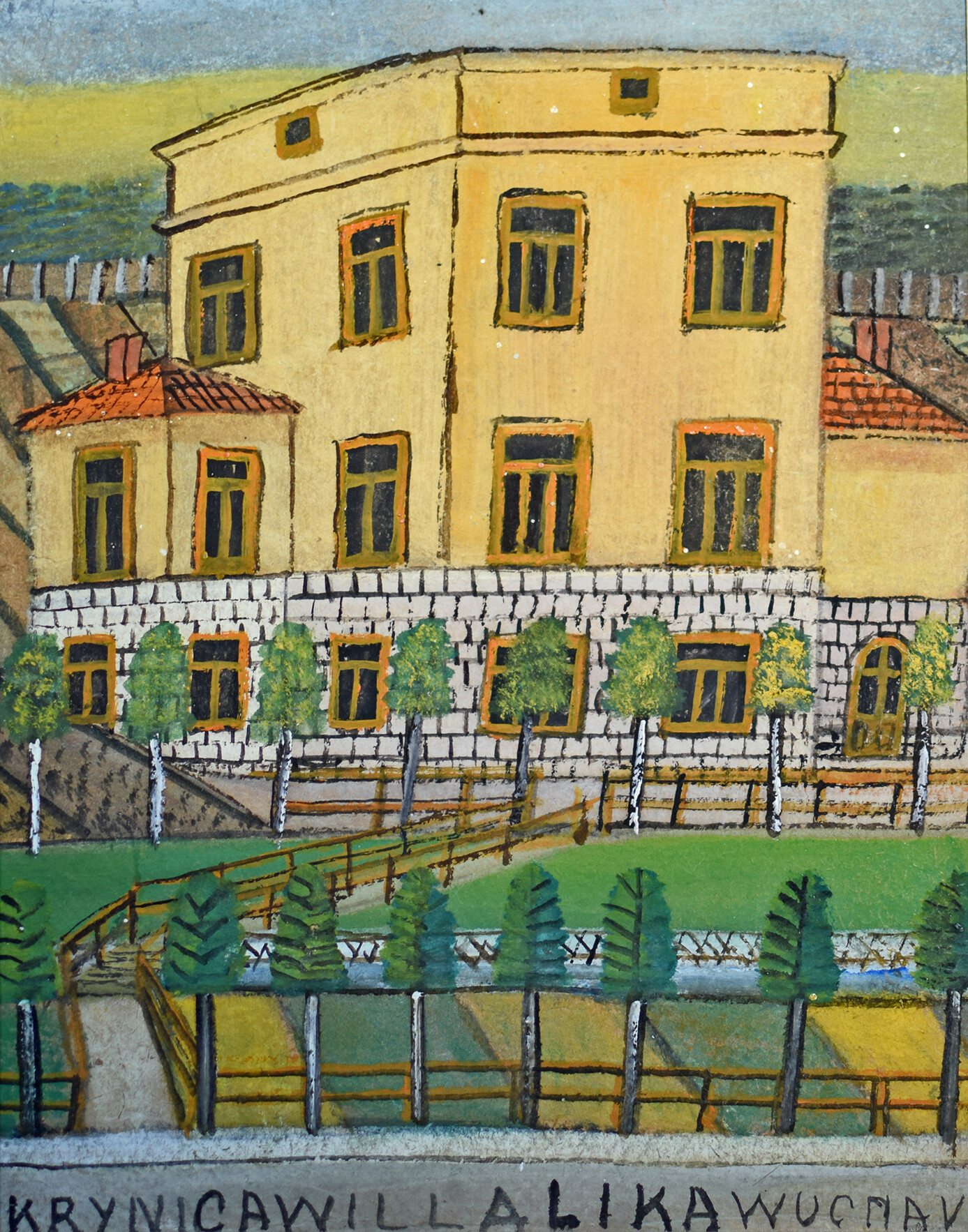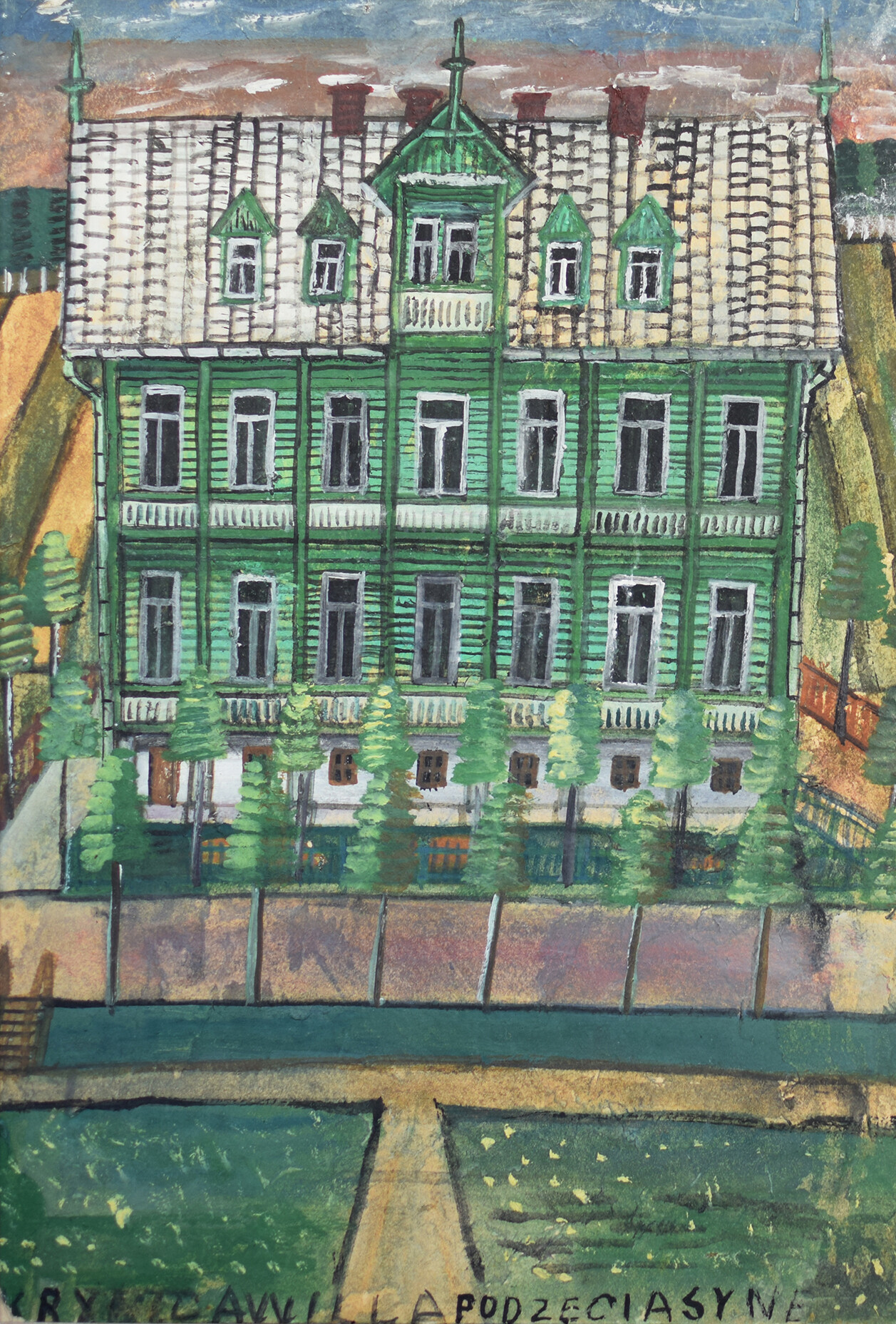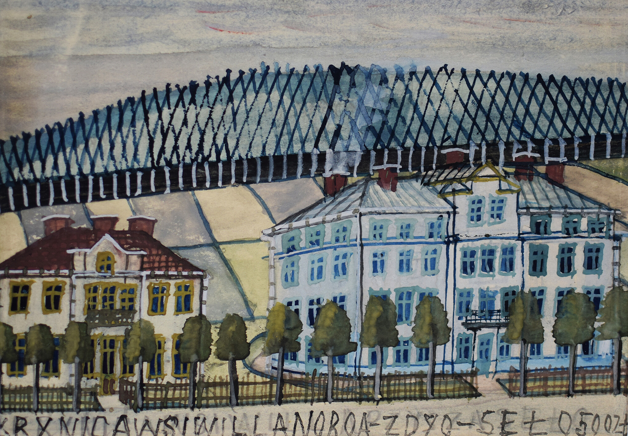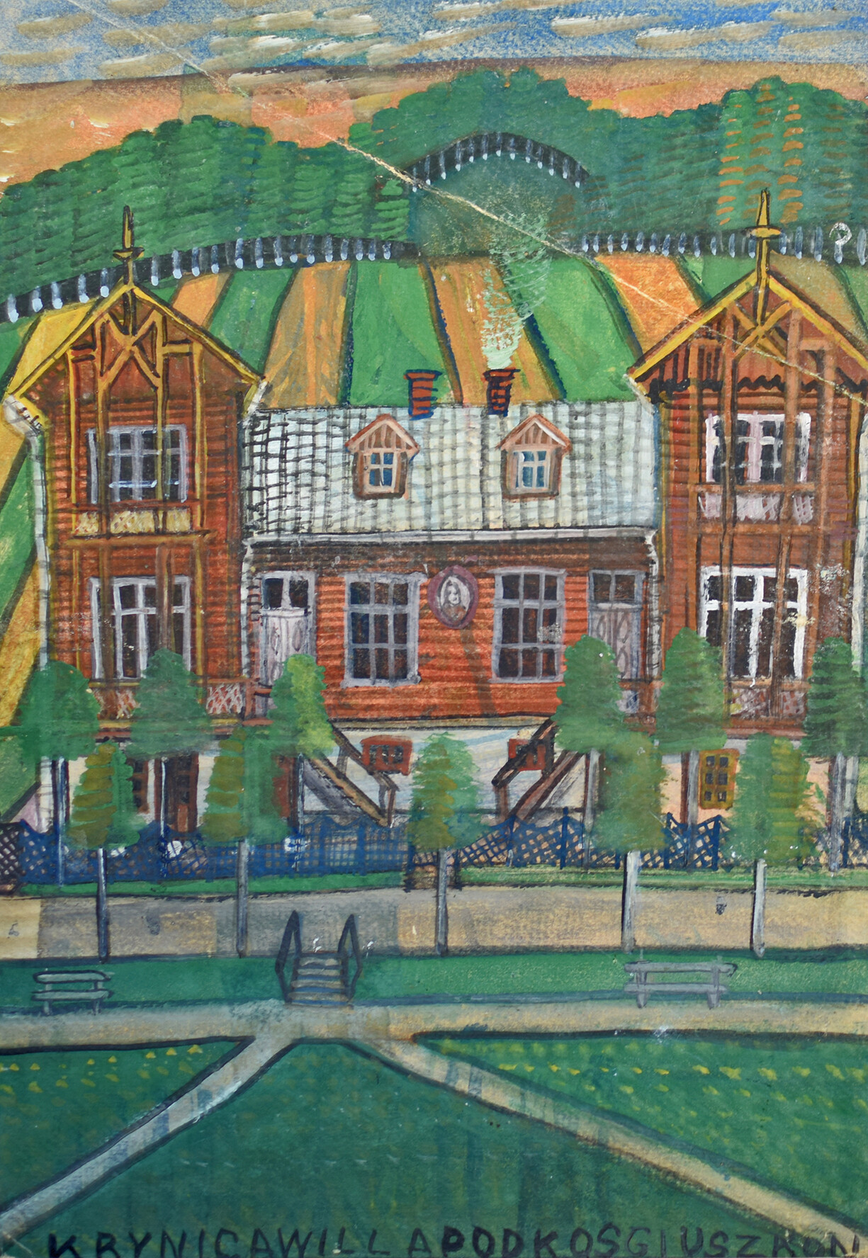 Title: Krynica, two tenement houses, in the background a checkerboard of fields and a forest