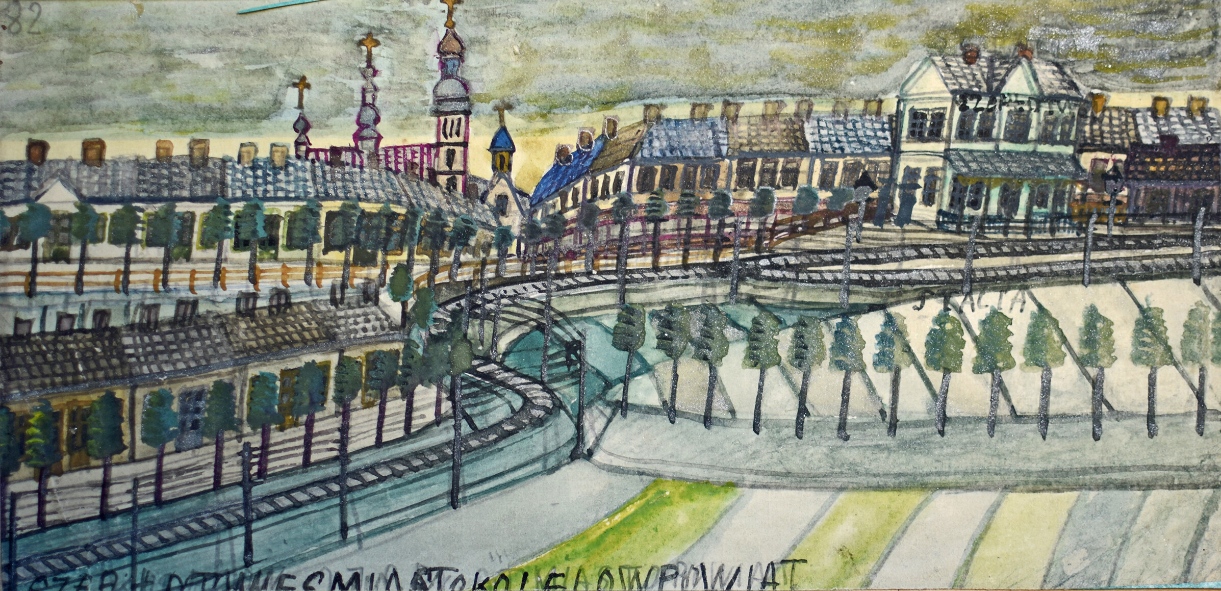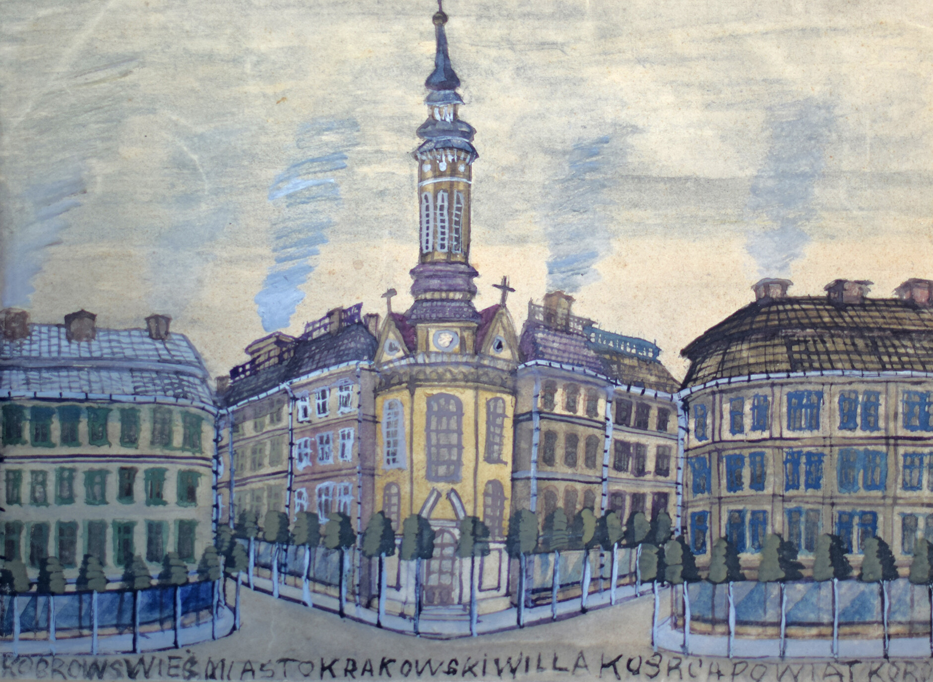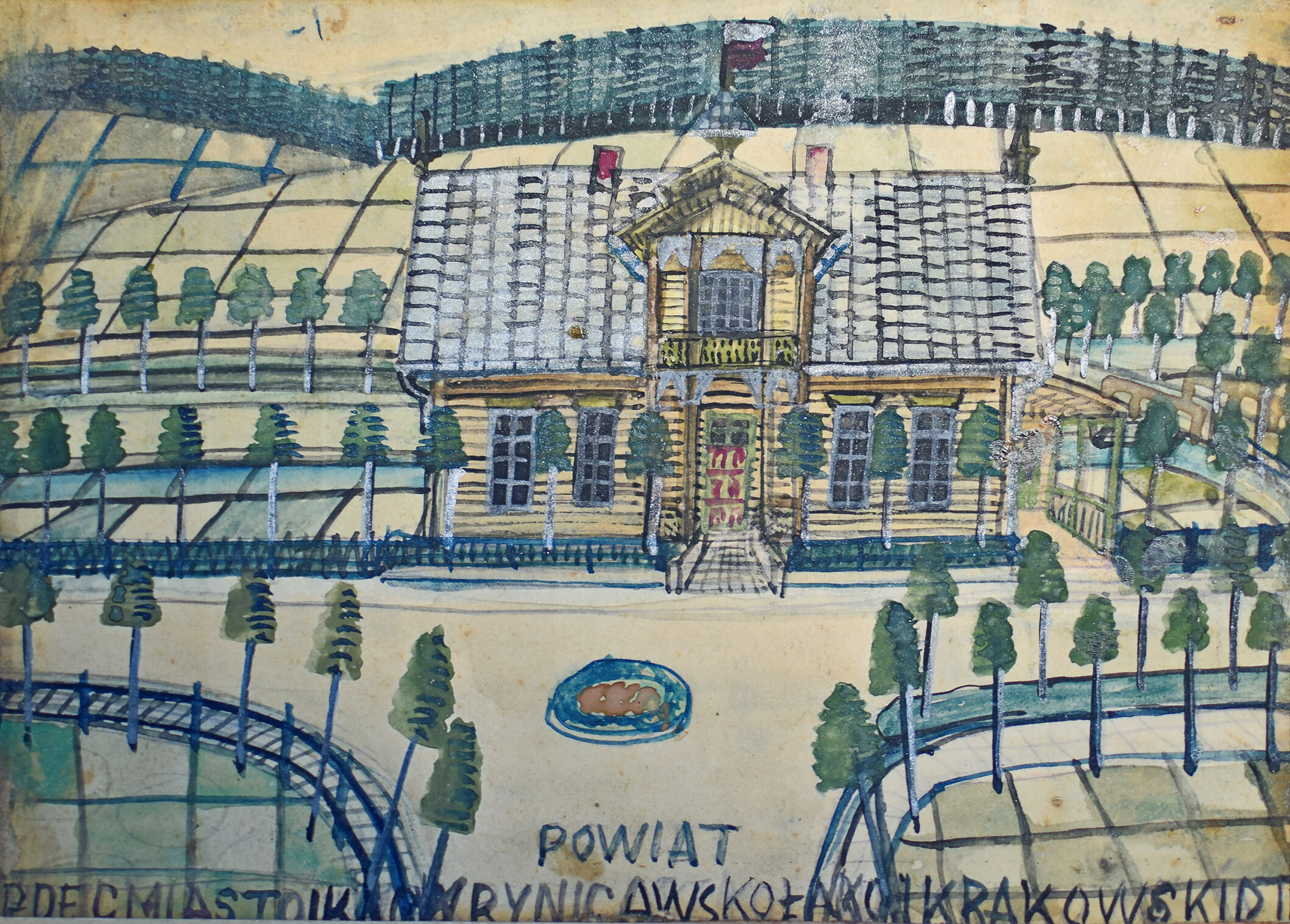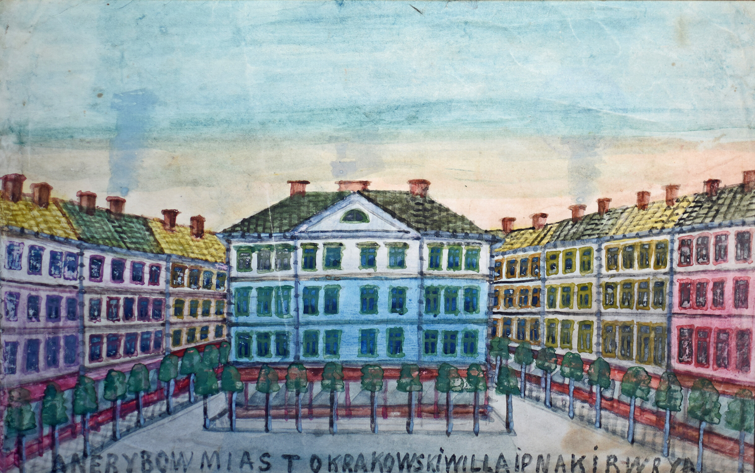 Title: Krynica, two tenement houses, in the background a checkerboard of fields and a forest