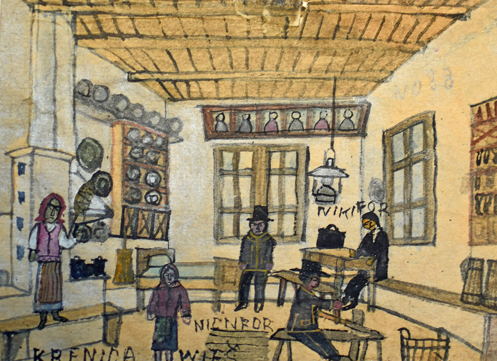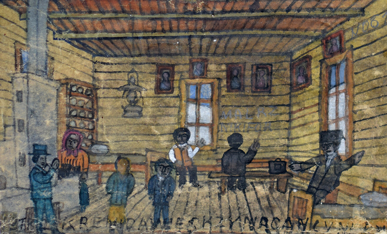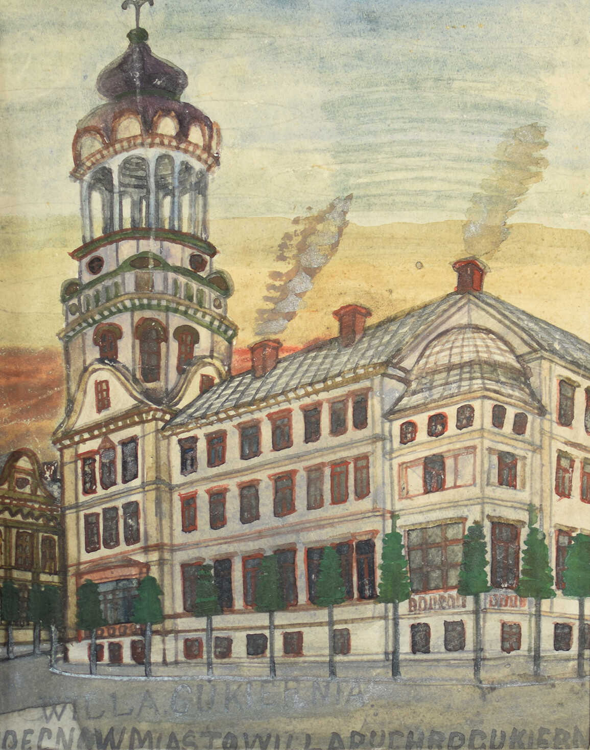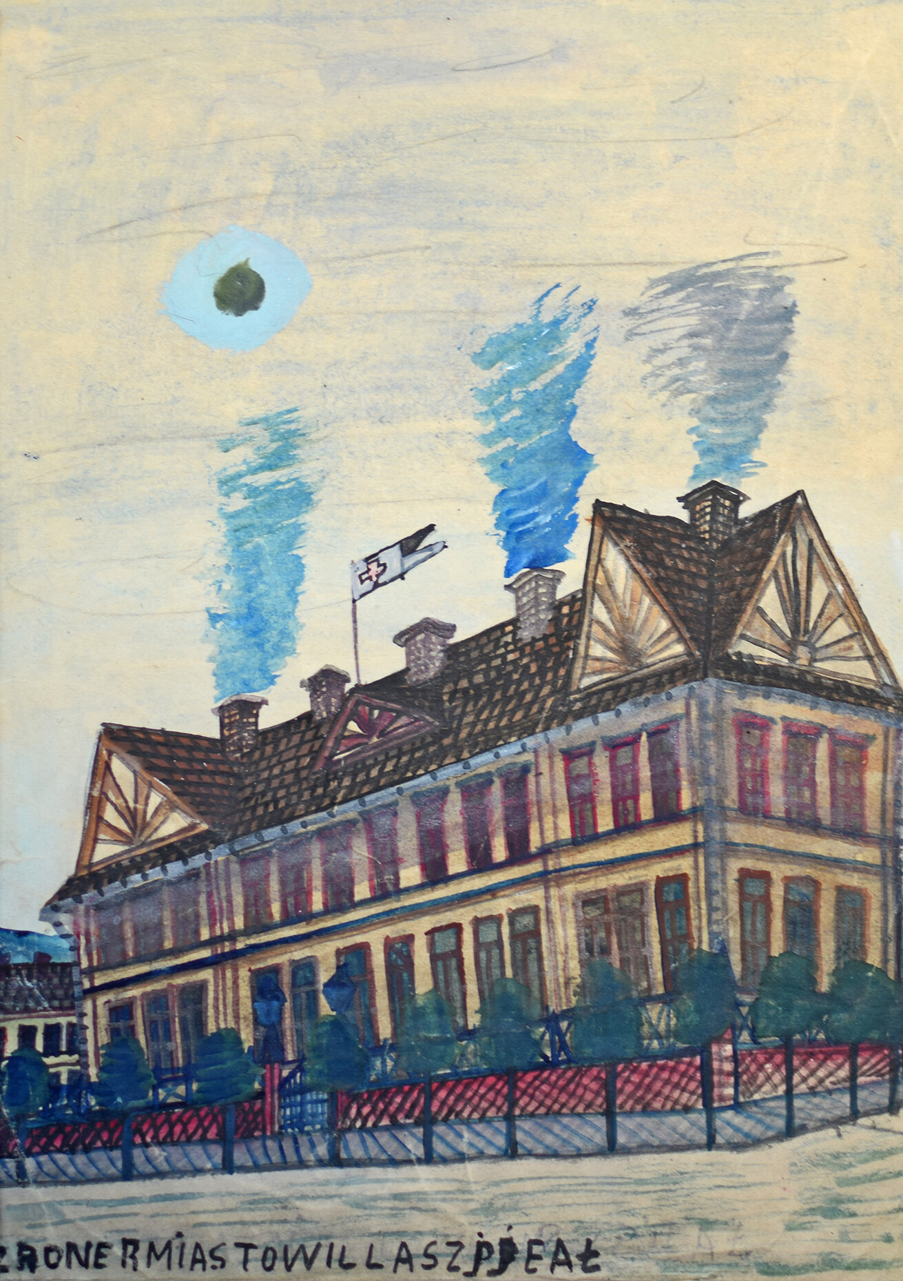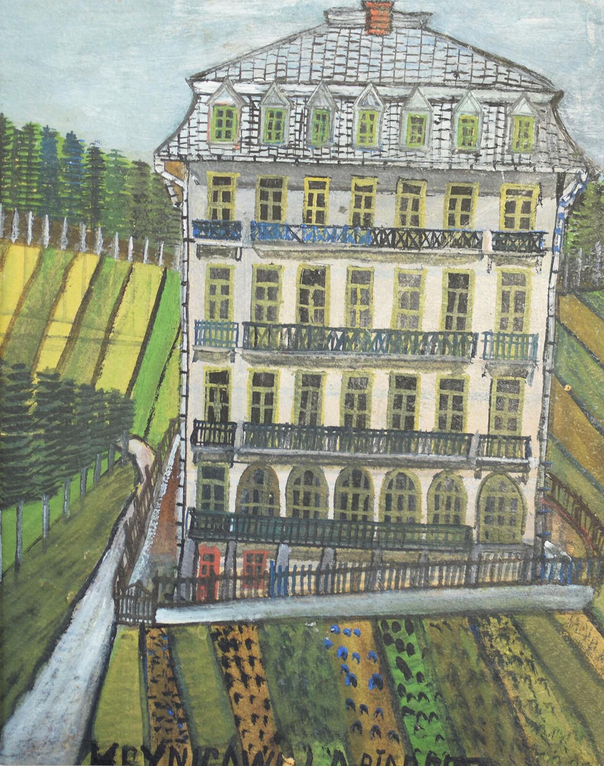 Title: Krynica, two tenement houses, in the background a checkerboard of fields and a forest