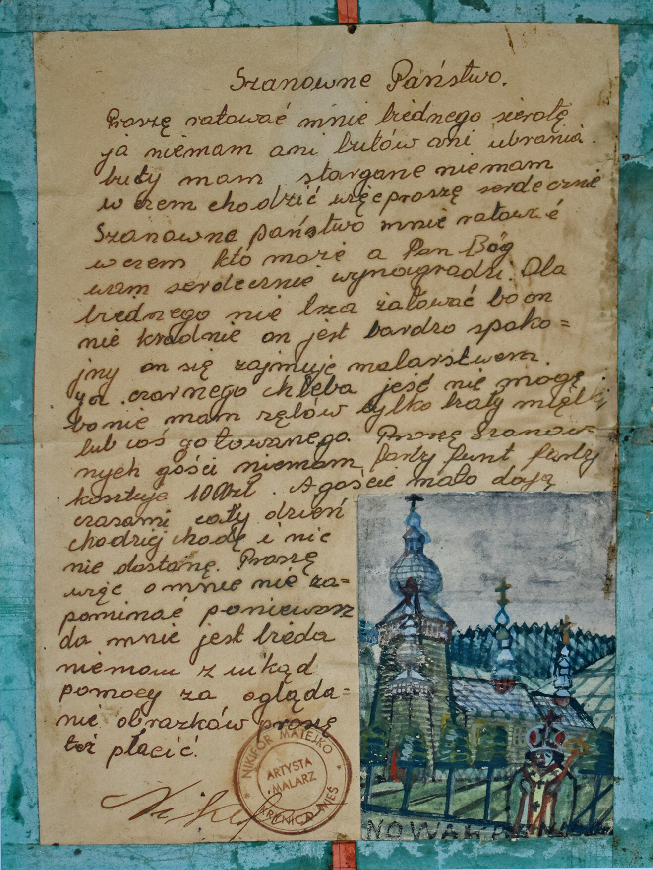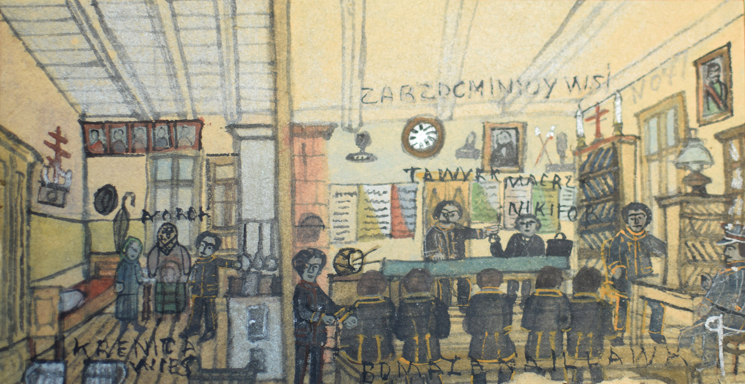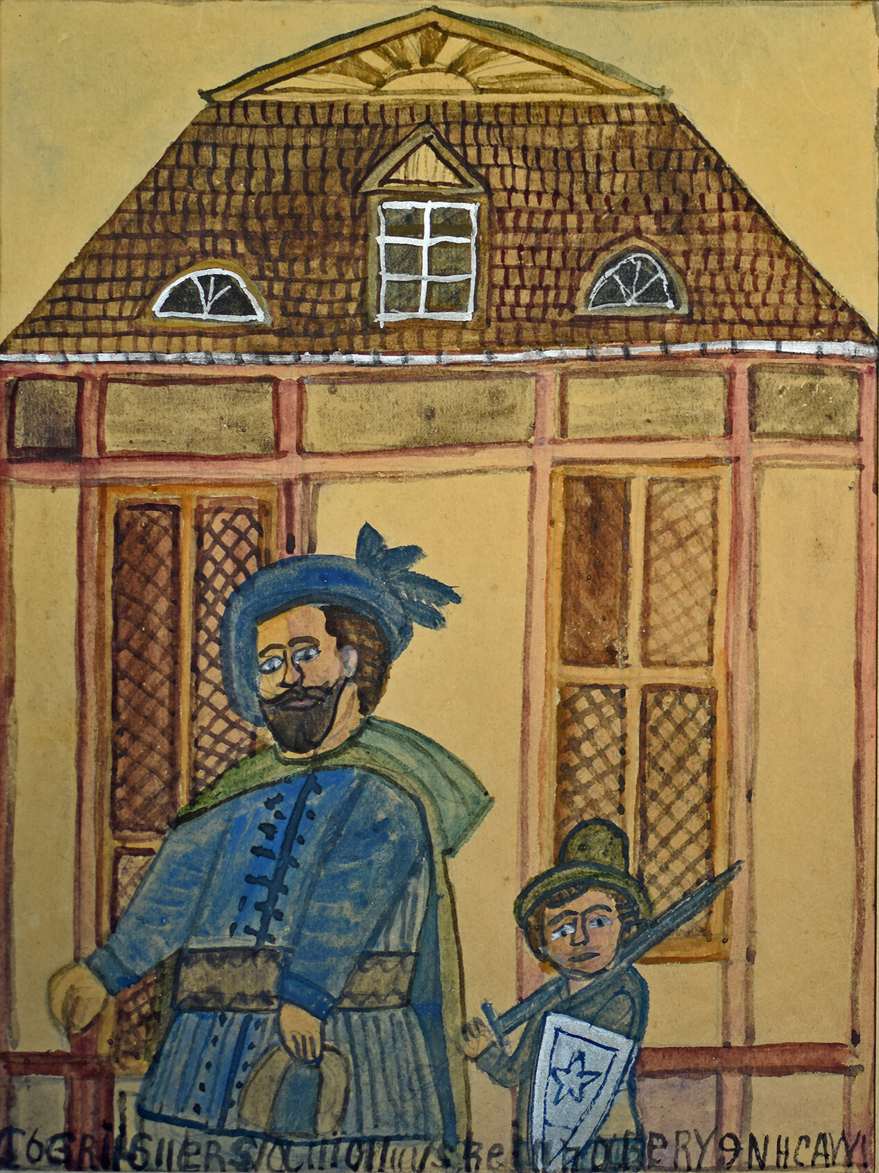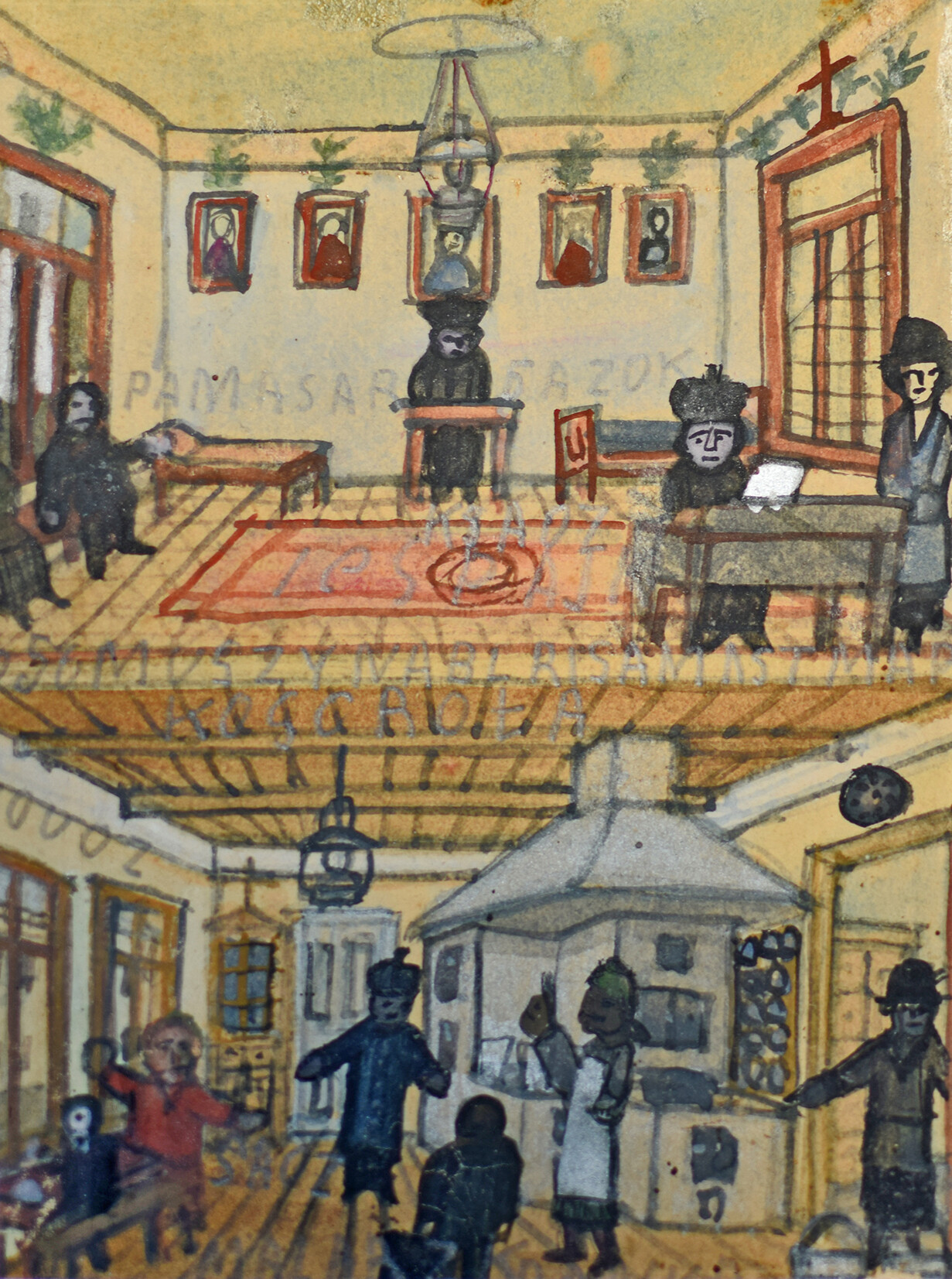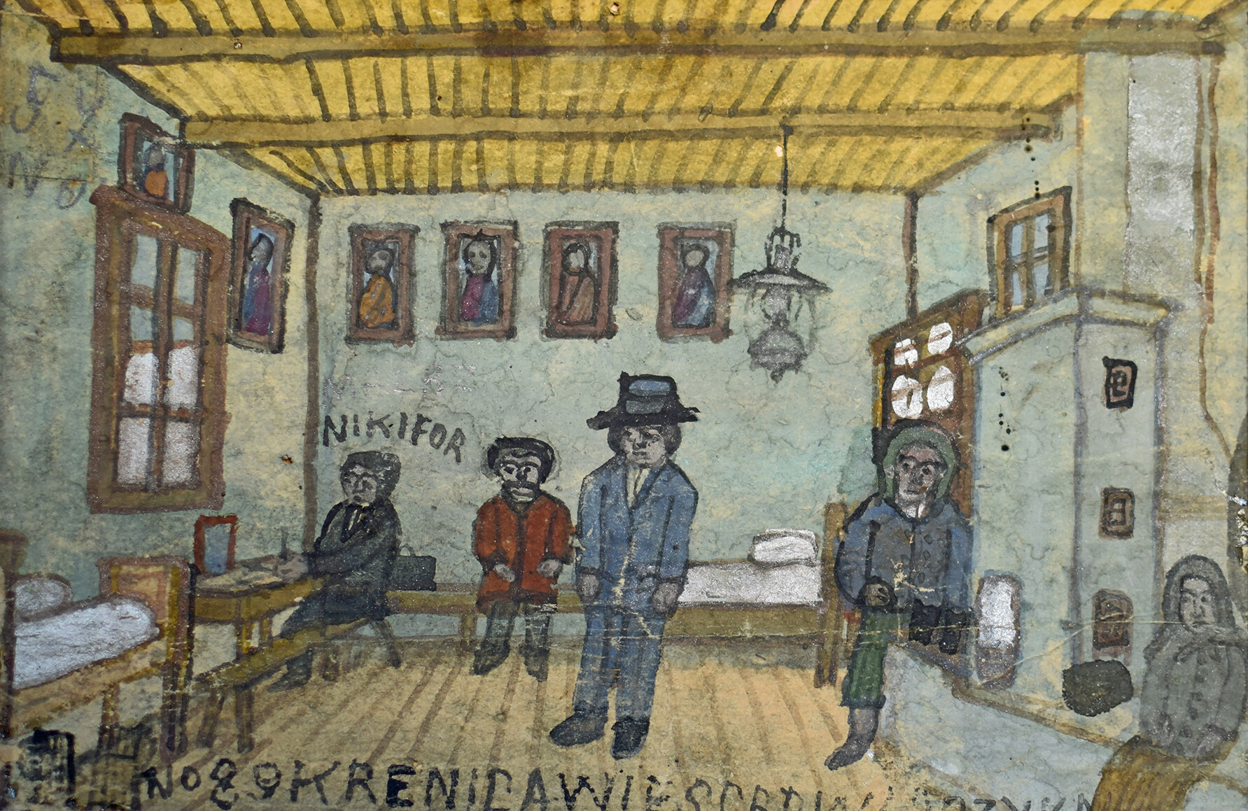 Title: Krynica, two tenement houses, in the background a checkerboard of fields and a forest