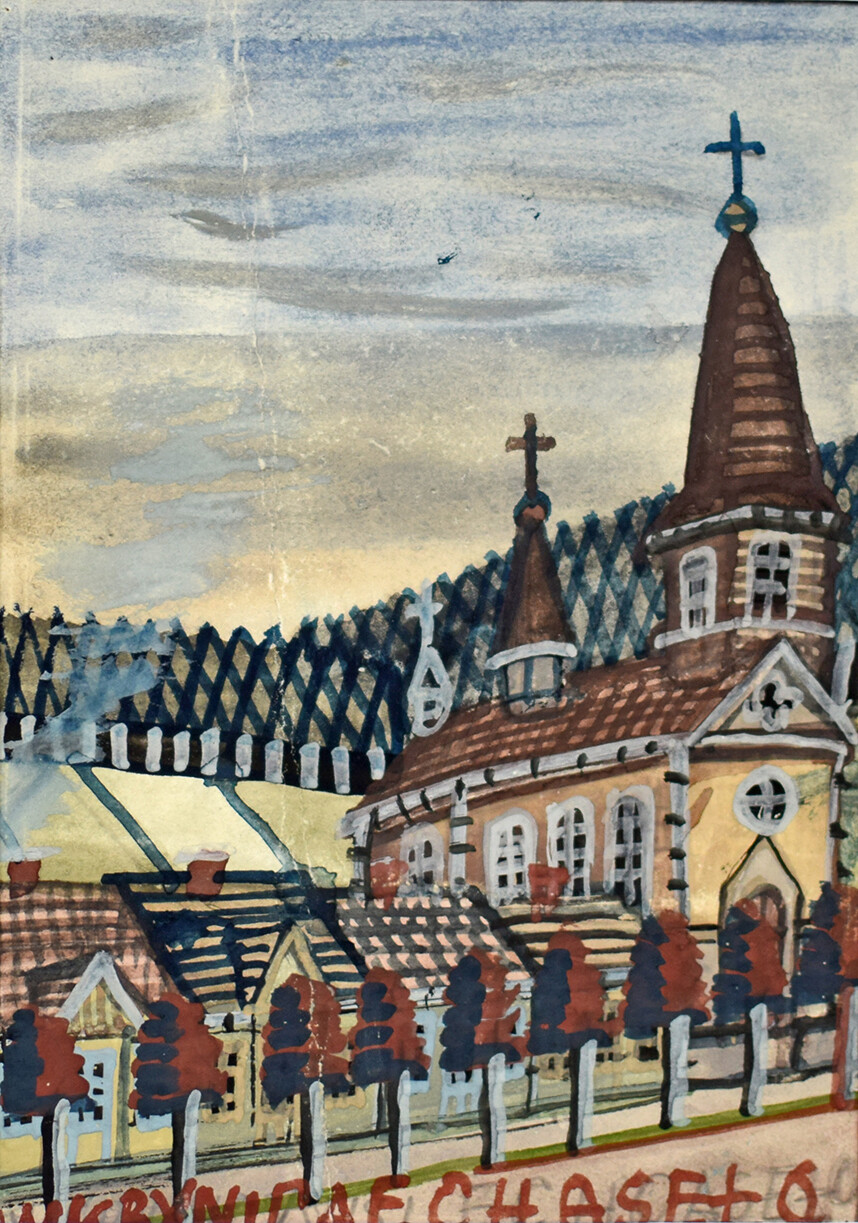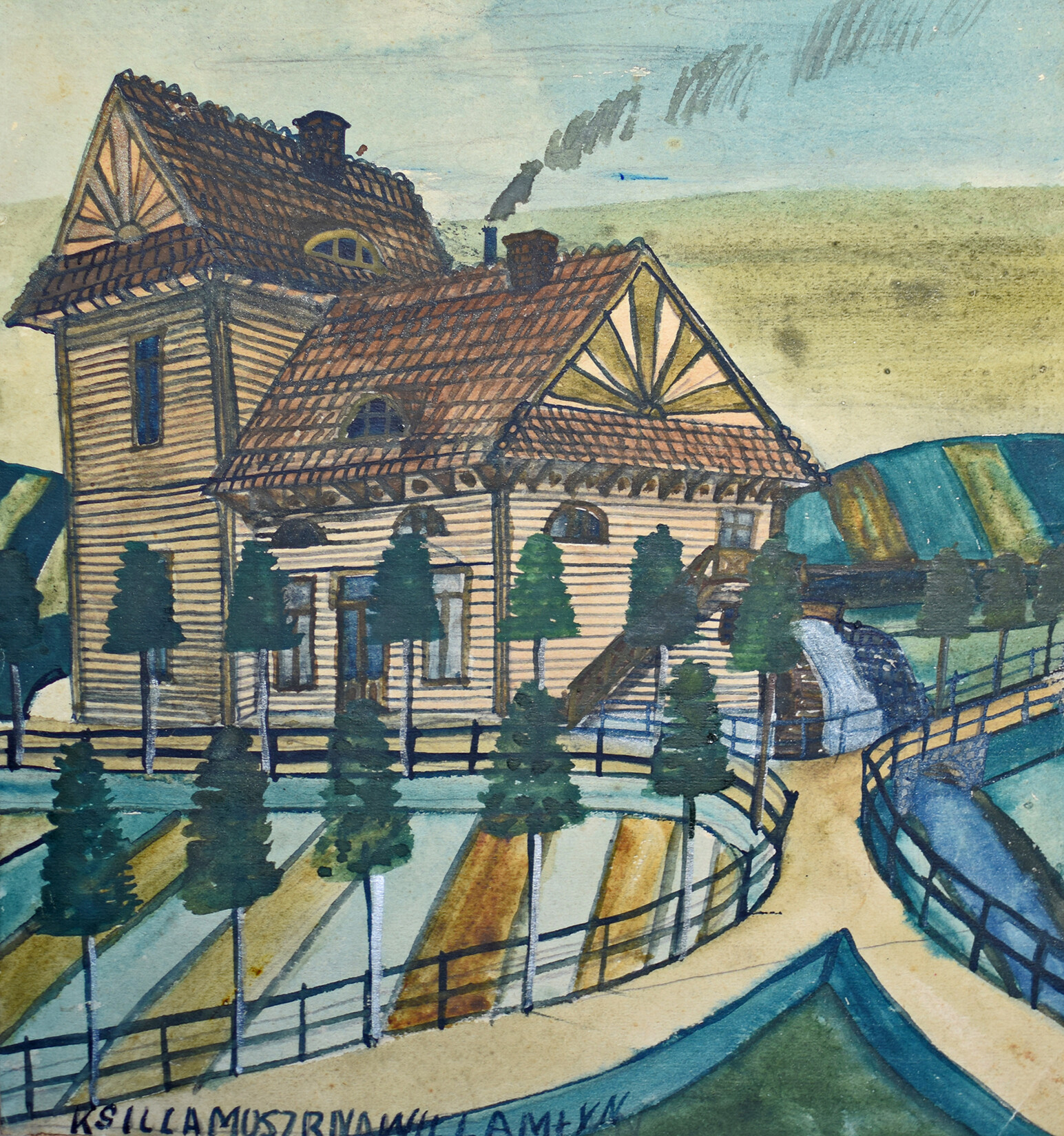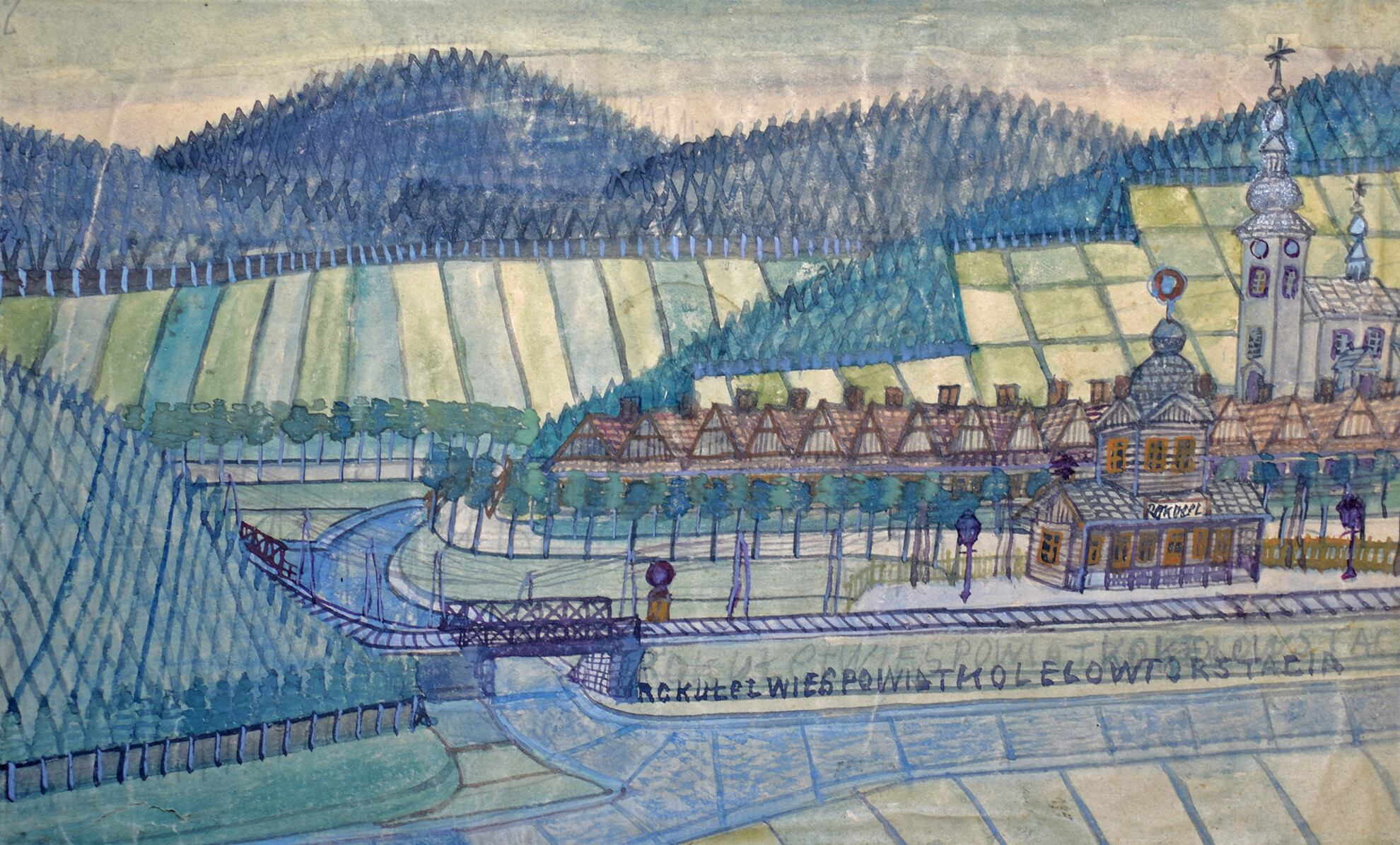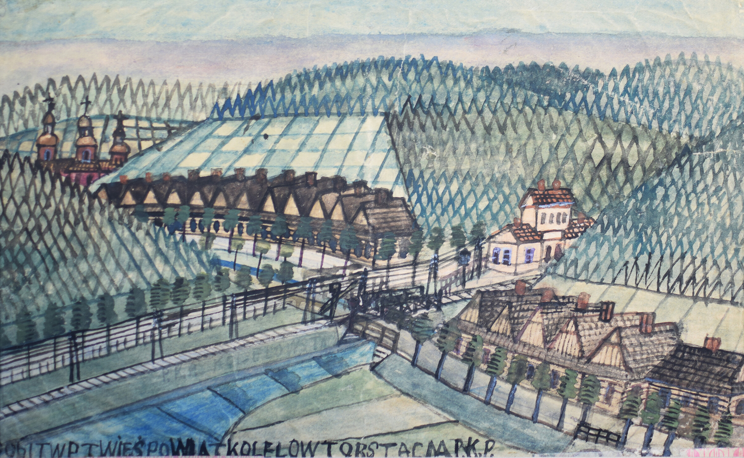 "Pejzaż beskidzki ze stacyjką kolejkową i cerkwią"
