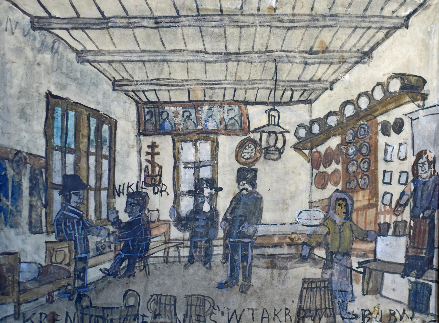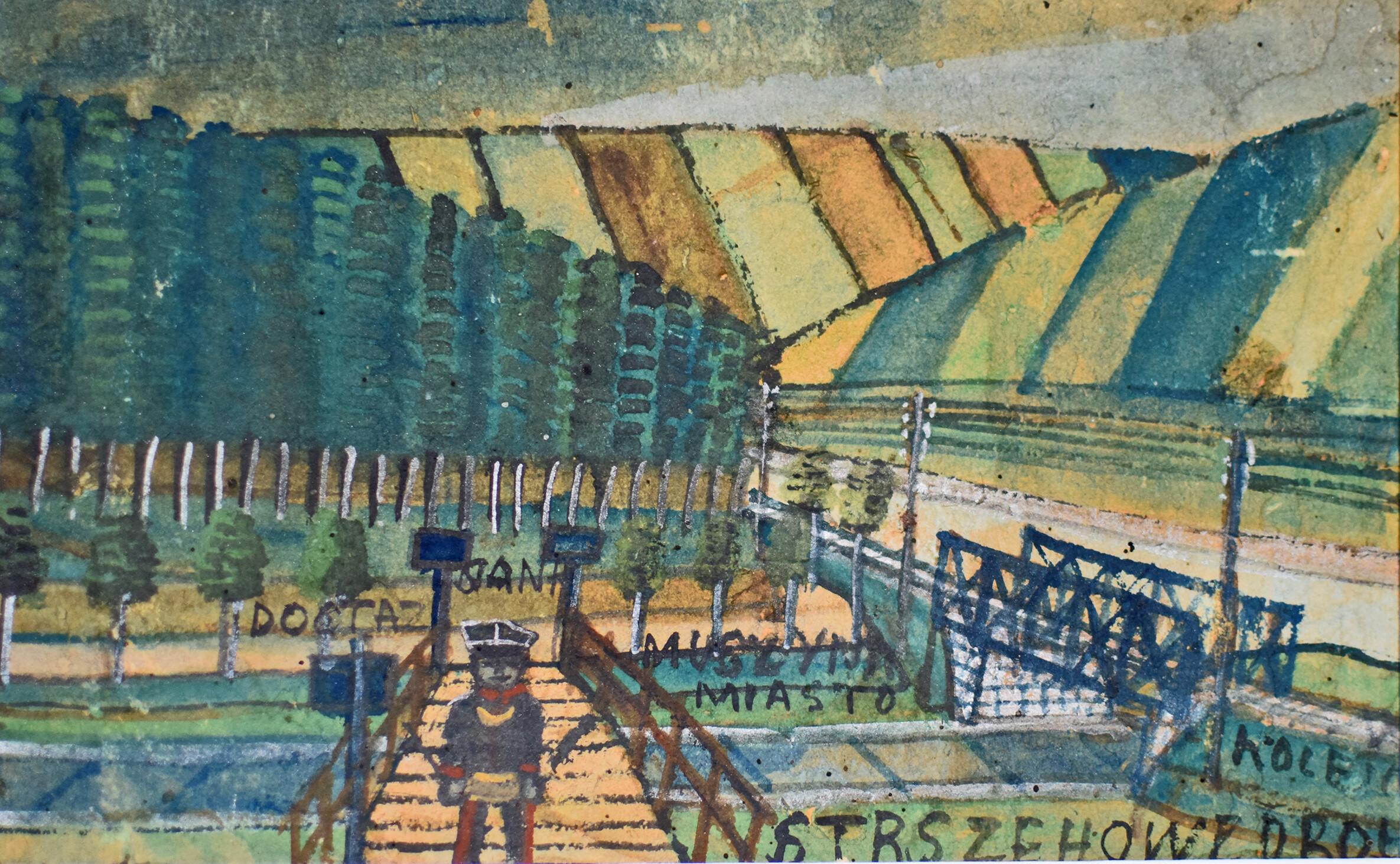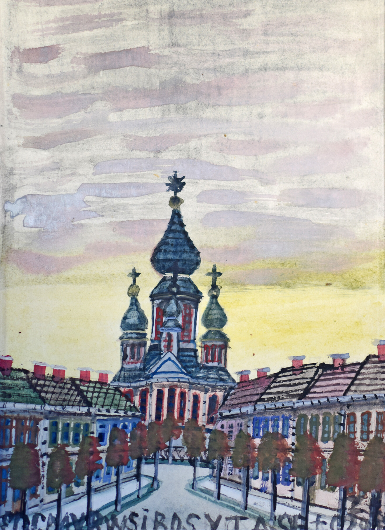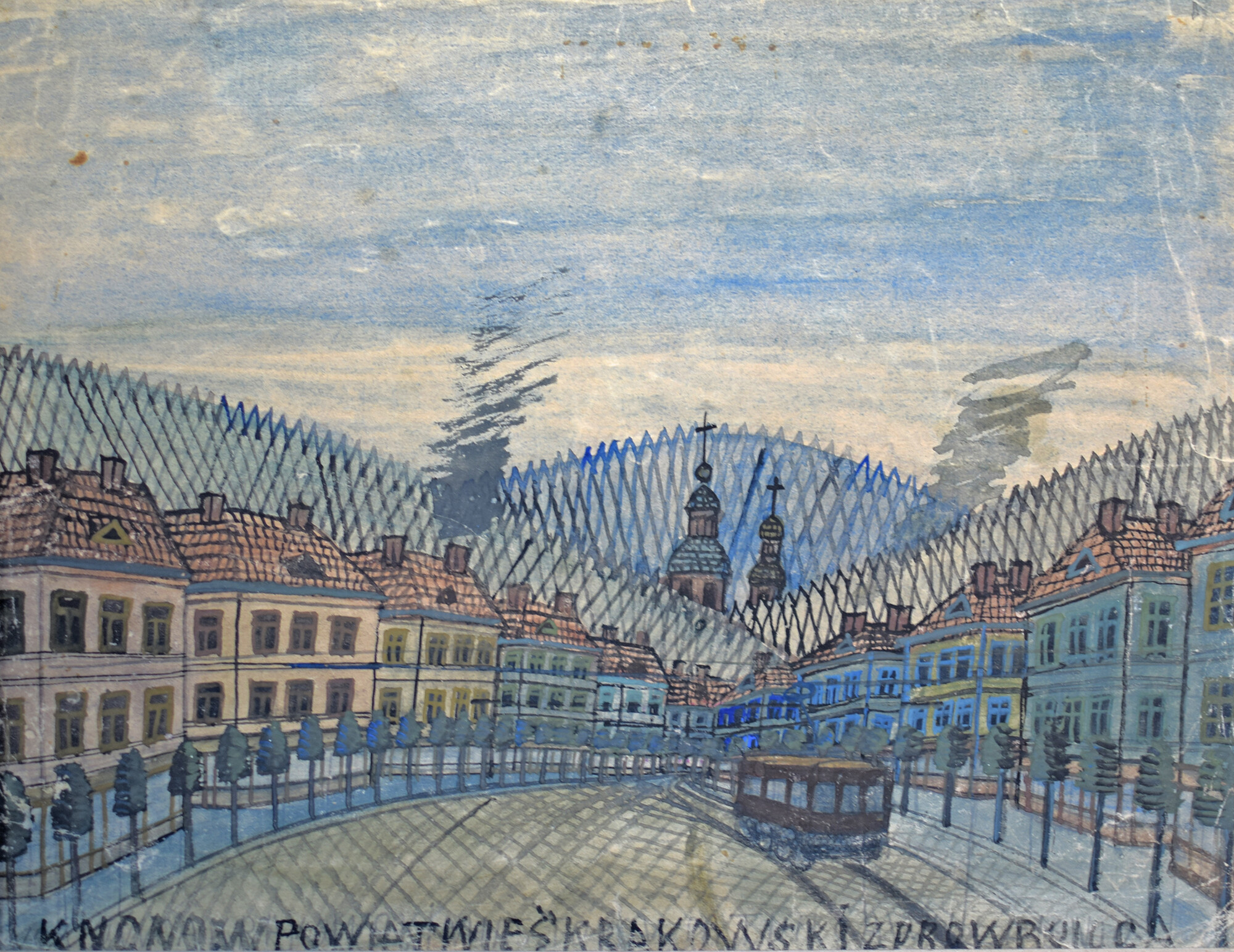"Pejzaż beskidzki ze stacyjką kolejkową i cerkwią"