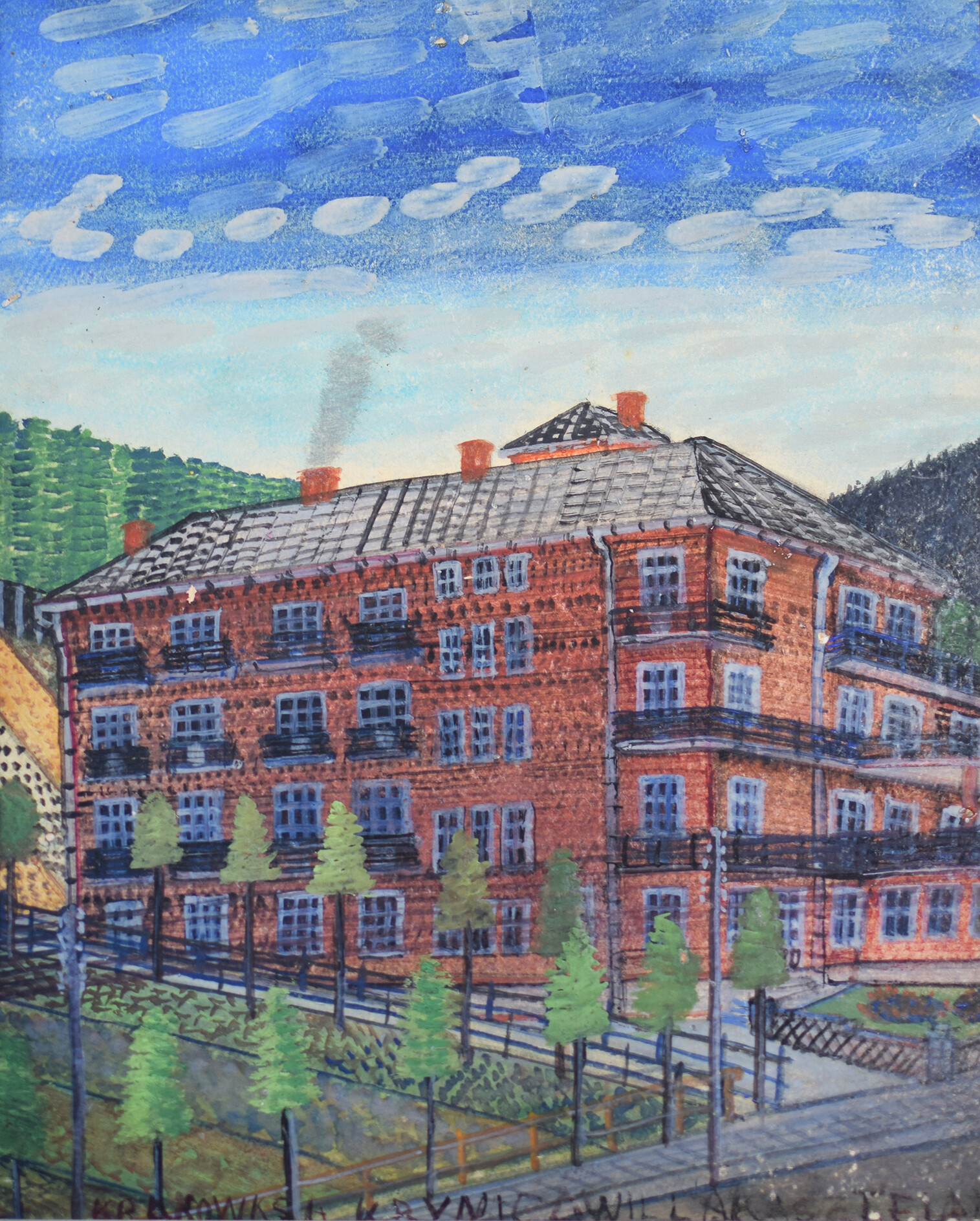 Наголовок: Крениця велика, червена будівля в гірскым пейзажы