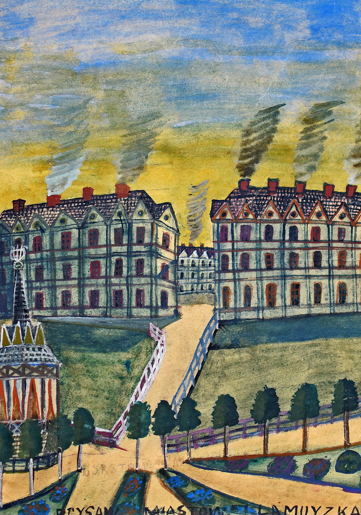 Наголовок: Містецка архітектура з костелом і шахівниця піль на першым пляні