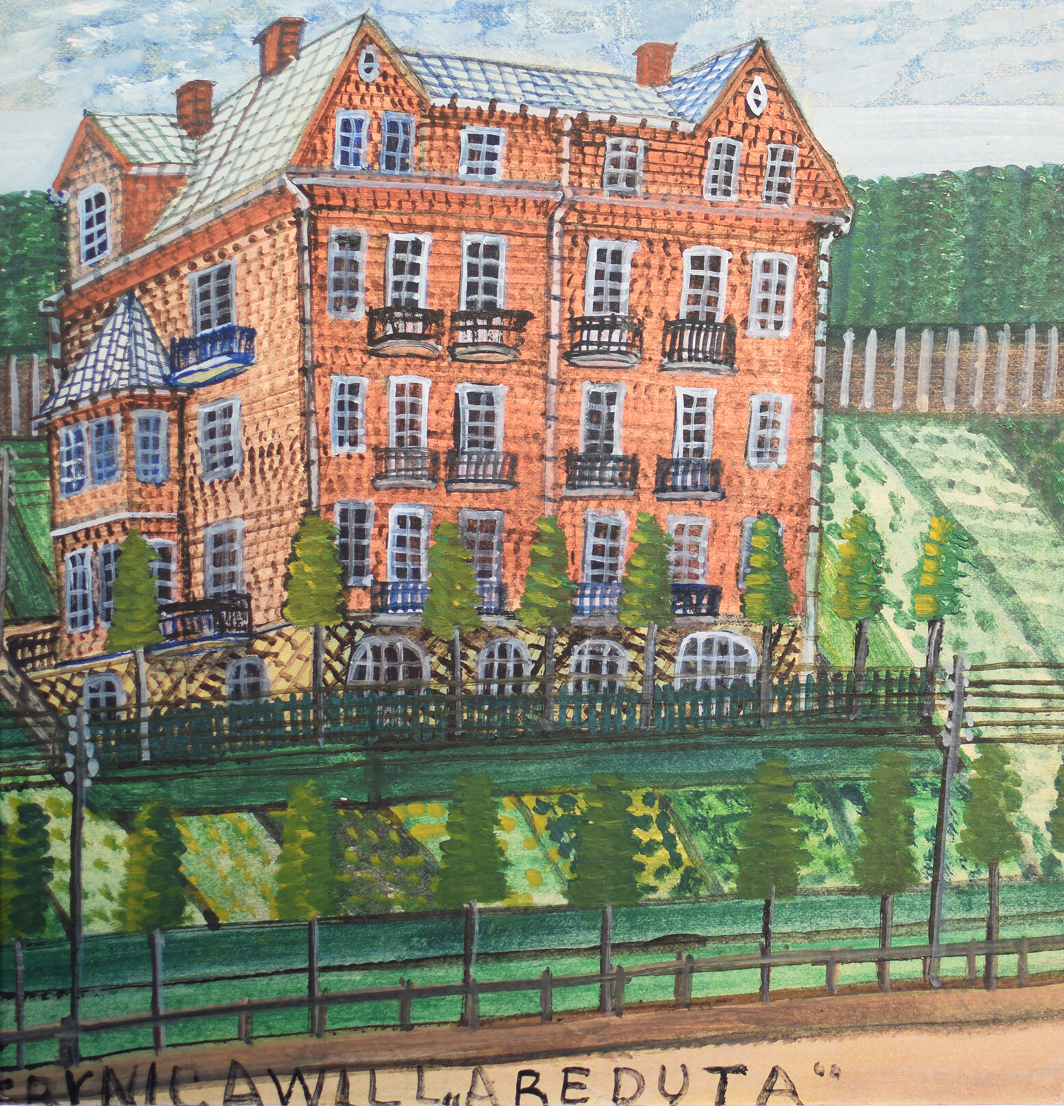 "Pejzaż beskidzki z drewnianą willą z flagą